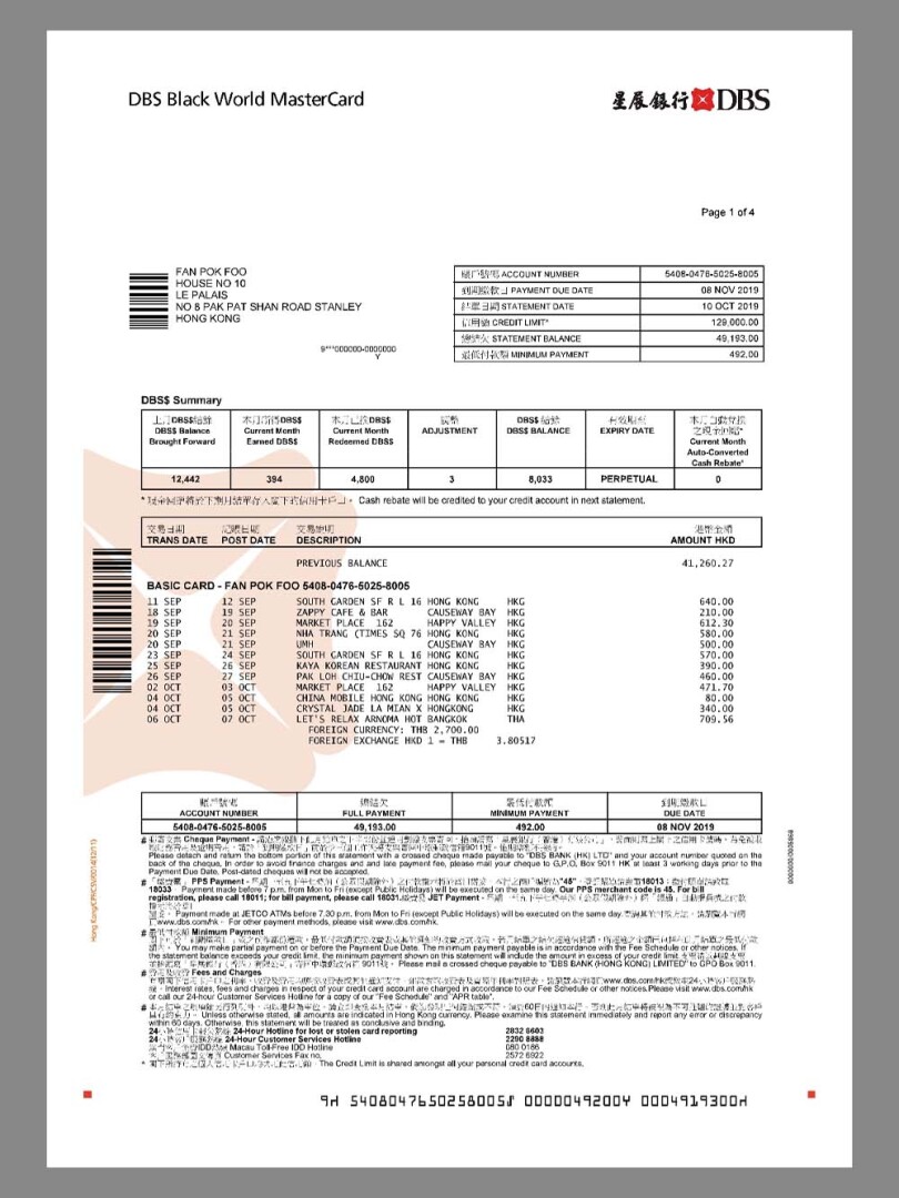 DBS Bank Statement新加坡/香港星展银行账单/KYC地址证明pdf模板