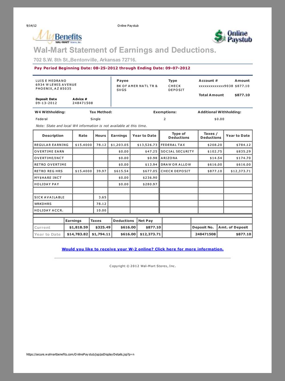 Walmart Paystub template沃尔玛工作收入证明/工资账单PDF模板